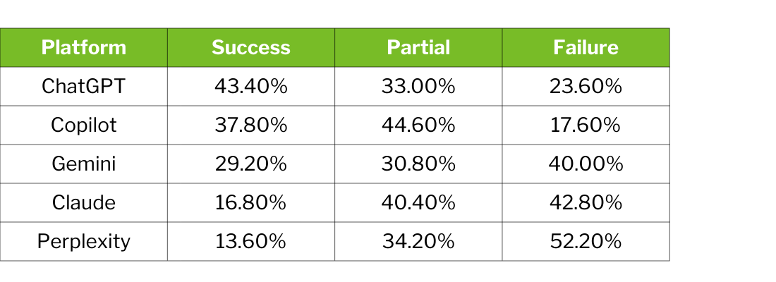Notably, platforms with formal merchant partnerships and structured data pipelines—ChatGPT with its Agentic Commerce Protocol, Copilot with Bing Shopping Graph—substantially outperform systems that rely primarily on web crawling.