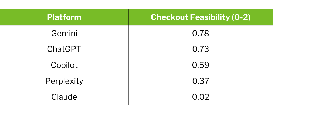 The correlation between checkout feasibility and overall success rates suggests that commerce infrastructure investment benefits not only checkout but also upstream steps, likely through access to structured merchant data and offer feeds.