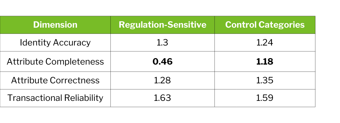 The balanced category design revealed that regulatory complexity correlates with weaker attribute completeness—but not necessarily weaker identity or correctness: