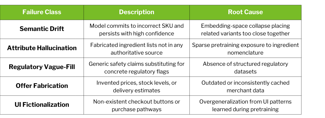 Beyond surface-level mistakes, we identified deeper failure classes that reflect structural weaknesses in how contemporary systems represent product information: